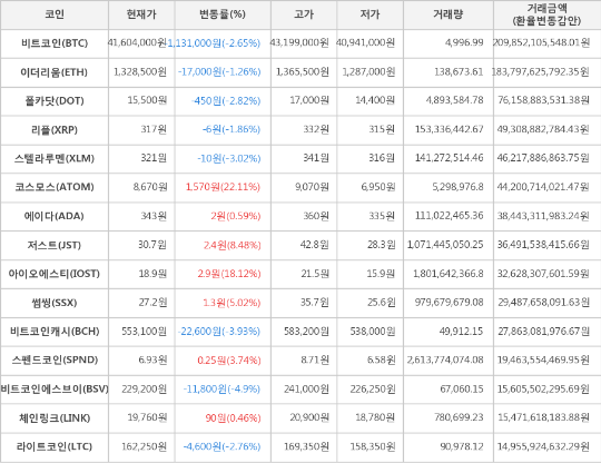가상화폐 시세 (제공: 암호화폐 거래소 업비트)현재 암호화폐 거래소 "업비트"에 따르면 가상화폐 대장 격인 비트코인의 시세는 전일 대비 -1,131,000원(-2.65%) 하락한 41,604,000원에 거래되고 있다.
