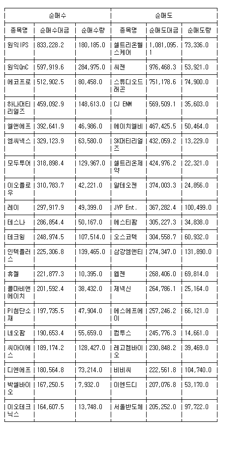 [표] 코스닥 기관 순매수도 상위종목(15일)