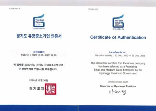 회사측에 따르면, 이번 선정에 따라 라온피플은 경기도 유망중소기업 현판과 인증서는 물론, 인증마크 사용권도 받게 된다.
