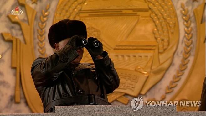 (서울=연합뉴스) 북한이 지난 14일 평양 김일성광장에서 노동당 8차 대회를 기념하는 열병식을 개최했다고 조선중앙TV가 15일 보도했다. 검은색 털모자를 쓴 김정은 국무위원장이 쌍안경을 들고 열병식을 지켜보고 있다. 2021.1.15