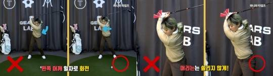 이에 대한 개선 방법은 테이크백에서 백스윙 올라가는 구간에 왼쪽 어깨 높이를 최대한 유지한다. 이후 옆으로 회전하는 느낌으로 백스윙을 연습하면 된다.