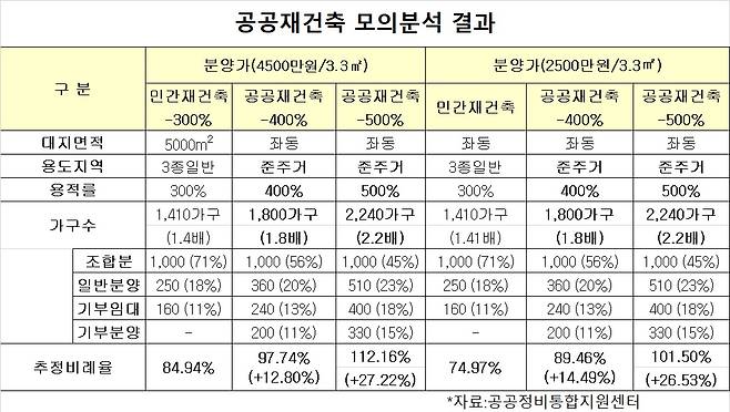 이는 정부가 이번에 내놓은 모의분석 결과를 통해서도 확인할 수 있다. 센터는 앞서 사례를 든 모의분석 대상 1000가구 단지 중 한 곳은 분양가를 3.3㎡당 4500만원을 받는다고 가정하고, 다른 한 곳은 2500만원을 받는 것으로 해서 ‘추정비례율’을 산정했다.
