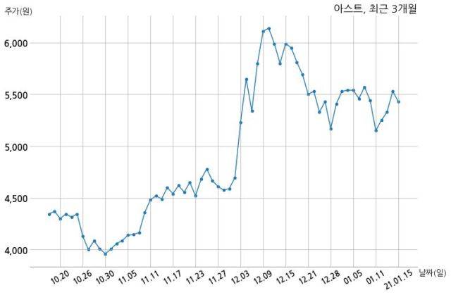 한편, 아스트는 장 마감 이후 해당 기업공시를 발표했으며 오늘 종가가 5,430원, 거래량은 298,747주로, 직전 거래일 대비 100원(-1.81%) 하락했다.