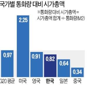 시중에 풀린 현금 유동성을 기준으로 봐도 마찬가지다. 한국 상장사의 시가총액 합계를 통화량(M2)으로 나눈 값은 0.82다. 주요 20개국(G20) 평균치인 0.97에 못 미친다. 미국은 2.25로 평균값의 2배 수준이다.