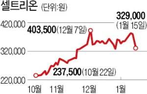 15일 셀트리온은 6.67% 하락한 32만9000원에 거래를 마쳤다. 지난 3거래일 동안의 주가 하락률은 14.32%에 달했다. 이 기간 외국인과 기관은 셀트리온 주식을 각각 918억원, 1046억원어치를 순매도했다. 셀트리온과 함께 ‘셀트리온 3형제’를 구성하는 셀트리온헬스케어(13일 이후 주가 -16.86%)와 셀트리온제약(-16.33%)도 하락세다.