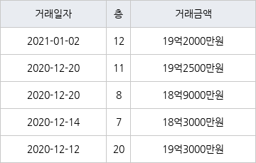 국토교통부 실거래가 공개시스템에 따르면 지난 2021년 1월 2일 서울특별시 용산구 이촌동 한가람아파트 12층 전용면적 84㎡형이 19억2000만원에 거래됐다. 지난 2021년 1월 2일 같은 면적형인 12층 물건이 19억2000만원에 실거래된 것과 비교해 같은 가격이다.