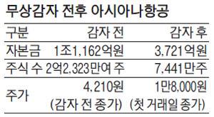 대한항공에 인수된 아시아나항공은 재무구조 개선을 위해 3대1 무상 균등 감자를 실시하면서 지난달 24일부터 매매거래가 정지됐다가 15일부터 거래가 재개됐다. 이번 감자로 아시아나항공 자본금은 1조1162억원에서 3721억원으로 줄게 됐다. 발행 보통주식 수도 2억2323만5294주에서 7441만1764주로 감소했다.