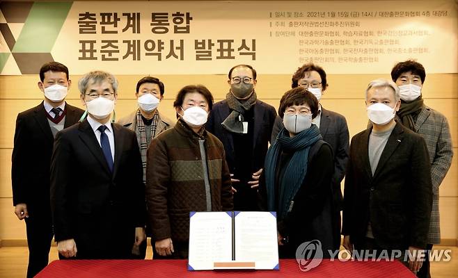 사진은 이날 서울 종로구 사무실에서 열린 출판계 통합 표준계약서 발표식에 참석한 윤철호 대한출판문화협회장(앞줄 왼쪽) 등 '출판저작권법선진화추진위원회' 소속 관계자들. 2021.1.15
