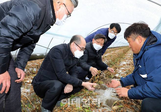 [이데일리 김태형 기자] 유찬형(왼쪽 두번째) 농협중앙회 부회장이 15일 폭설 한파 피해를 입은 전북 김제시 광활농협 관내 시설감자 재배농가를 방문해 피해상황을 점검하고 현장 의견을 청취하고 있다.