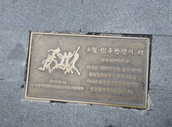 | ▲ 1987년 6월항쟁 때 울산시민들이 운집했던 성남동 거리에 2019년 제막된 6월민주화항쟁의 터 동판 |