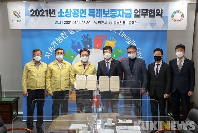 [아산=쿠키뉴스] 한상욱 기자 = 충남신용보증재단(이사장 유성준)은 지난 14일 당진시청에서 김홍장 시장이 참석한 가운데 ‘당진시 소상공인 특례보증 및 저신용 소상공인 특례보증 업무협약’을 체결했다고 15일 밝혔다(사진).