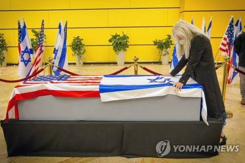 epa08938402 Miriam Adelson touches the casket of her husband, Sheldon Adelson upon arrival to Ben Gurion Airport, near the city of Lod, Israel, 14 January 2021 (issued 15 January 2021). Adelson, the billionaire mogul and power broker who built a casino empire spanning from Las Vegas to China and became a singular force in domestic and international politics has died after a long illness, his wife said on 12 January 2021. ( EPA/AMI SHOOMAN / ISRAEL HAYOM / POOL ISRAEL OUT