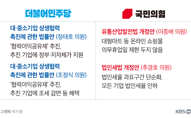 이번엔 국민의힘 발의 법안을 볼까요? 유통산업발전법 개정안은, 현행법 단서 조항을 개정해 대형마트 온라인 쇼핑몰의 의무 휴업일을 제한하지 않도록 하는 법안입니다. 또 법인세법 개정안은 모든 기업의 법인세율을 낮추는 게 골자인데, 이익 공유제와는 언뜻 연관이 없어 보입니다.