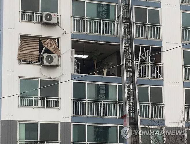 (양양=연합뉴스) 15일 오후 가스폭발 사고가 발생한 강원 양양군의 한 아파트 유리창이 부서져 있다. 2021.1.15