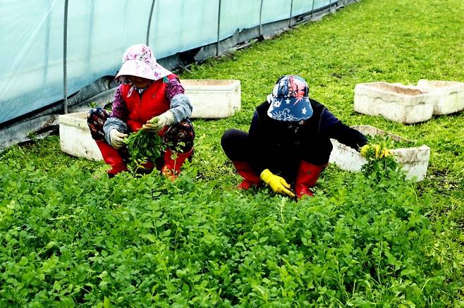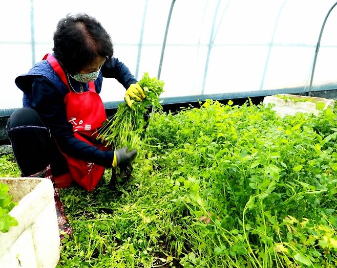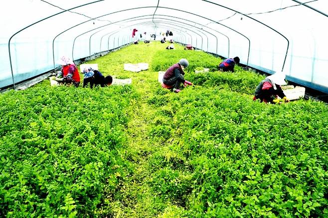 [의령=쿠키뉴스] 강종효 기자 = 경남 의령의 명산인 자굴산(897m)기슭에 자리한 가례면 대천마을 김수용씨 비닐하우스에서 14일 혹한의 추위를 뚫고 새파랗게 자란 의령 특산품 '자굴산 청정 밭 미나리'를 마을 주민들이 삼삼오오 모여 수확에 여념이 없다.