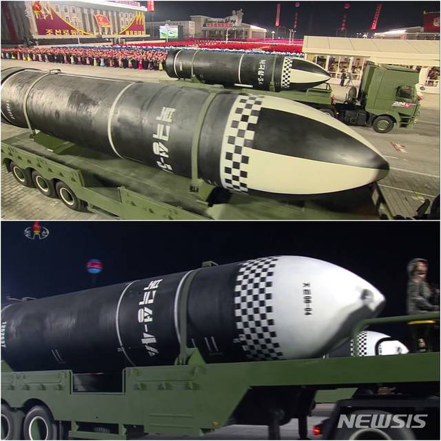 [서울=뉴시스]지난 14일 평양 김일성광장에서 열린 조선노동당 제8차 대회 기념 열병식에서 '북극성-5ㅅ' 문구가 적힌 신형 추정 잠수함발사탄도미사일(SLBM)이 등장하고 있다. 아래는 지난해 10월 10일 당창건 75주년 열병식에서 공개된 '북극성-4ㅅ' SLBM. (사진=조선중앙TV 캡쳐) 2021.01.15. photo@newsis.com