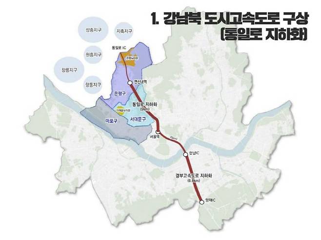 그가 꺼내든 첫번째 개선책은 통일로 지하화(양방 6차로 대심도 터널)다. 현재 검토중인 경부고속도로 한남~양재 지하화 사업과 연계한다는 계획이다. 21km의 강남북 도시고속도로가 되는 것이다. 지하도로 구간은 은평의 중심인 연신내에서 서울역을 거쳐 한남~양재 경부고속도로를 지하로 연결한다. 이렇게 된다면 강북에서 강남까지 30분내 접근이 가능하다.