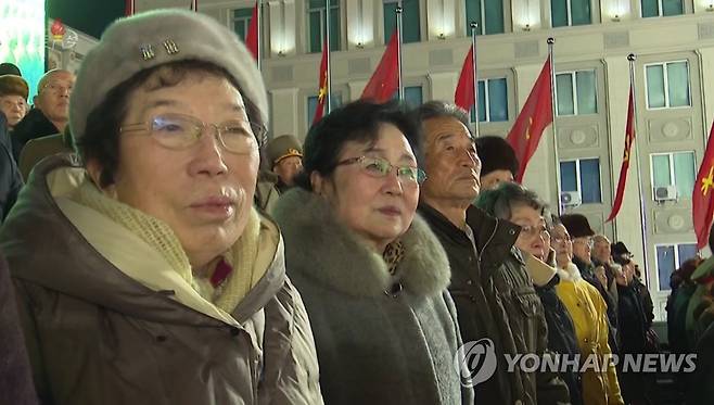 (서울=연합뉴스) 북한이 지난 14일 노동당 제8차 대회를 기념하는 열병식을 진행했다고 조선중앙TV가 15일 보도했다. 열병식을 보기 위해 평양 김일성 광장에 모인 관중들이 모두 마스크를 쓰지 않고 있다. 8차 당대회 대표단은 대회 기간 실내에서도 대체로 마스크를 쓰지 않고 있었다. [조선중앙TV 화면] 2021.1.15