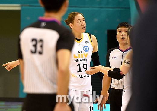[마이데일리 = 부천 유진형 기자] KB스타즈 박지수가 15일 오후 경기도 부천실내체육관에서 진행된 'KB국민은행 Liiv M 2020-2021 여자프로농구' 하나원큐와 KB스타즈의 경기에서 주심에게 항의하고 있다.