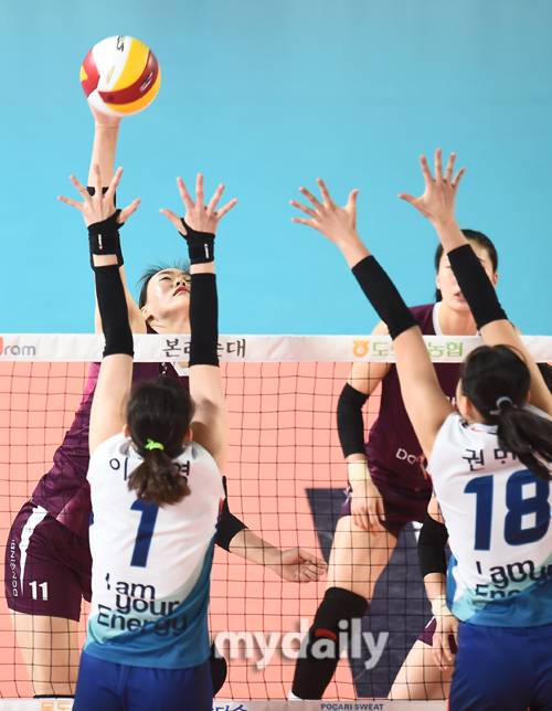 [마이데일리 = 대전 곽경훈 기자] 인삼공사 최은지가 15일 오후 대전충무체육관에서 진행된 '2020-2021 도드람 V-리그' 인삼공사-GS칼텍스의 경기에서 공격을 시도하고 있다.- ⓒ마이데일리(www.mydaily.co.kr). 무단전재&재배포 금지 -