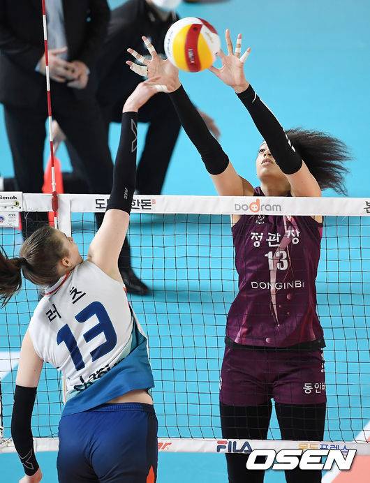 1세트 KGC인삼공사 디우프가 GS칼텍스 러츠의 스파이크를 막아내고 있다. /youngrae@osen.co.kr