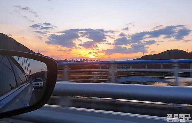 대구 외곽 지대를 지나면서 차안 조수석에서 담은 노을빛입니다.
