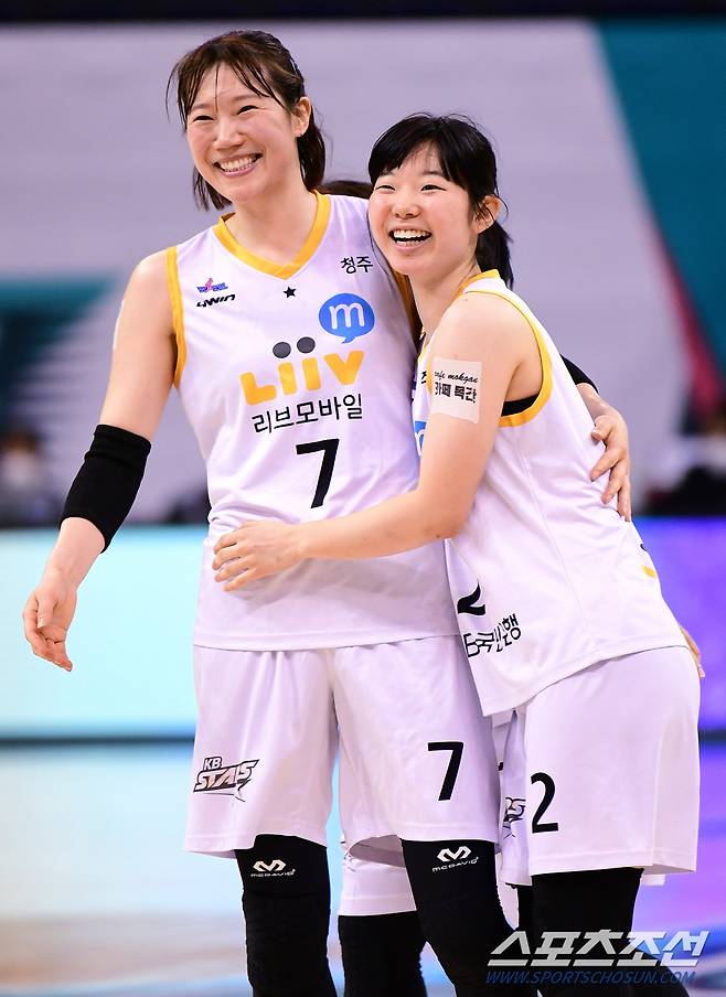 2020-2021 여자프로농구 KB스타즈와 하나원큐의 경기가 15일 부천체육관에서 열렸다. KB스타즈 허예은이 중거리슛을 성공시킨 후 강아정의 축하를 받고 있다. 부천=정재근 기자 cjg@sportschosun.com/2021.1.15/