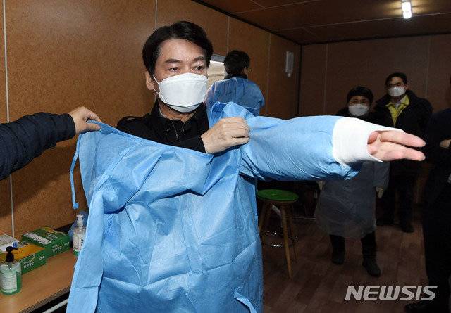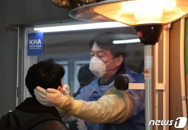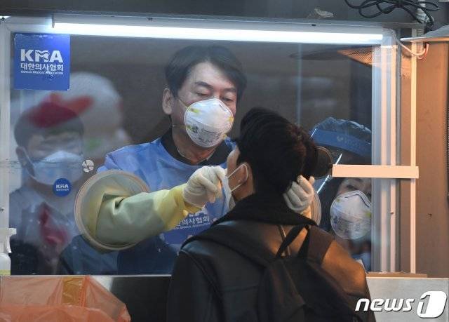 안 대표는 15일 서울 중구 서울광장 임시 선별검사소를 찾았다. 파란색 방호복 차림의 안 대표는 시민의 검체를 채취했다.