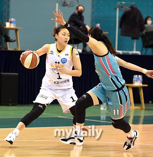 [마이데일리 = 부천 유진형 기자] KB스타즈 염윤아가 15일 오후 경기도 부천실내체육관에서 진행된 'KB국민은행 Liiv M 2020-2021 여자프로농구' 하나원큐와 KB스타즈의 경기에서 드리볼 돌파를 시도하고 있다.