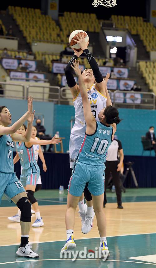 [마이데일리 = 부천 유진형 기자] KB스타즈 박지수가 15일 오후 경기도 부천실내체육관에서 진행된 'KB국민은행 Liiv M 2020-2021 여자프로농구' 하나원큐와 KB스타즈의 경기에서 골밑공격을 시도하고 있다.