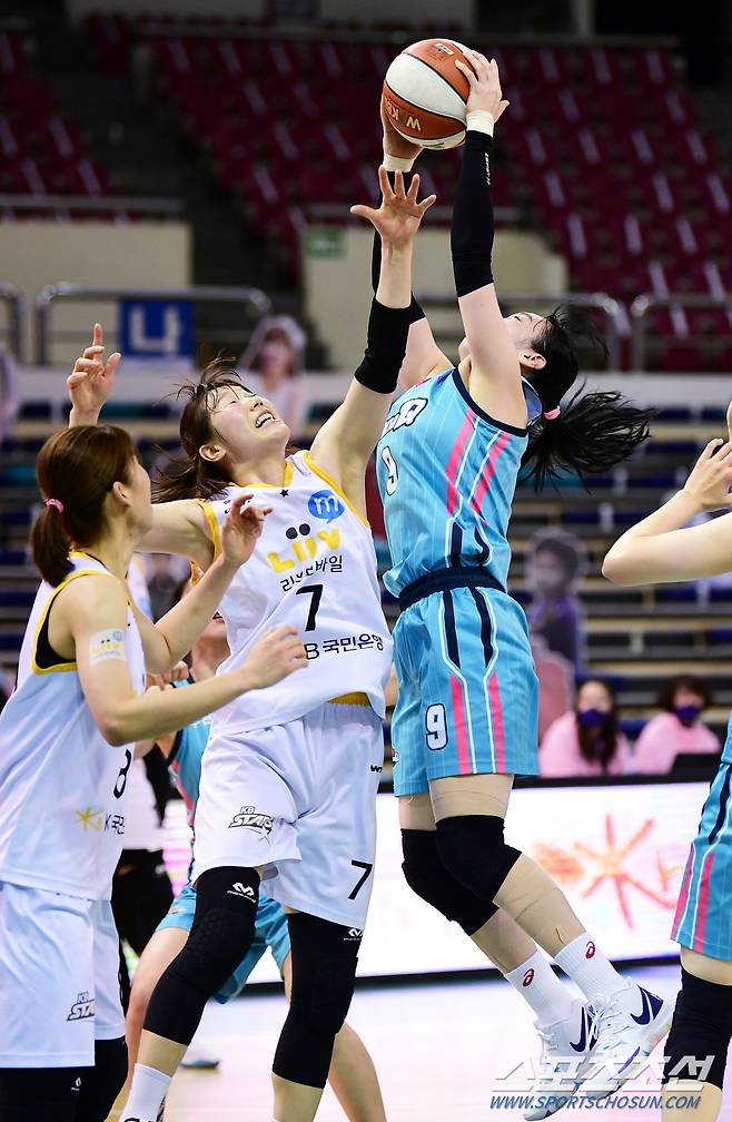 2020-2021 여자프로농구 KB스타즈와 하나원큐의 경기가 15일 부천체육관에서 열렸다. 하나원큐 백지은이 KB스타즈 강이정을 제치며 리바운드볼을 잡고 있다. 부천=정재근 기자 cjg@sportschosun.com/2021.1.15/