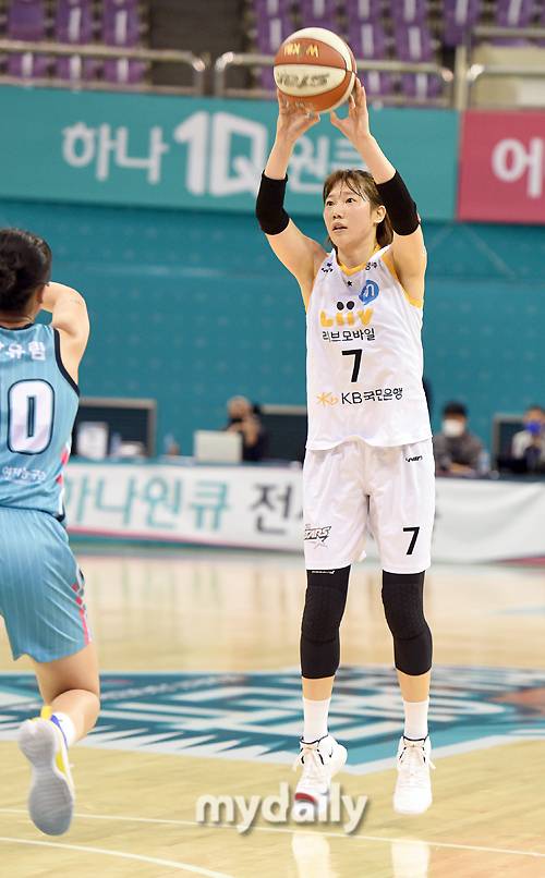 [마이데일리 = 부천 유진형 기자] KB스타즈 강아정이 15일 오후 경기도 부천실내체육관에서 진행된 'KB국민은행 Liiv M 2020-2021 여자프로농구' 하나원큐와 KB스타즈의 경기에서 3점슛을 시도하고 있다.