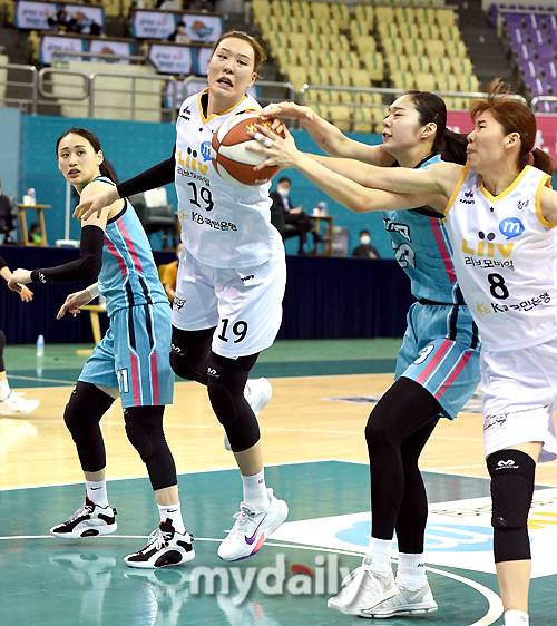[마이데일리 = 부천 유진형 기자] KB스타즈 박지수가 15일 오후 경기도 부천실내체육관에서 진행된 'KB국민은행 Liiv M 2020-2021 여자프로농구' 하나원큐와 KB스타즈의 경기에서 리바운드를 다투고 있다.
