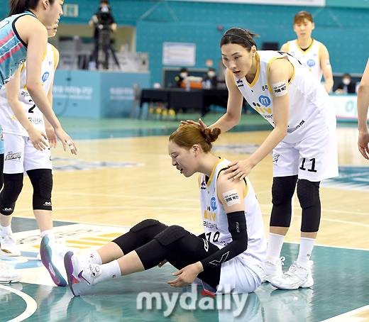 [마이데일리 = 부천 유진형 기자] KB스타즈 박지수가 15일 오후 경기도 부천실내체육관에서 진행된 'KB국민은행 Liiv M 2020-2021 여자프로농구' 하나원큐와 KB스타즈의 경기에서 코트에 넘어진 뒤 힘들어하고 있다.