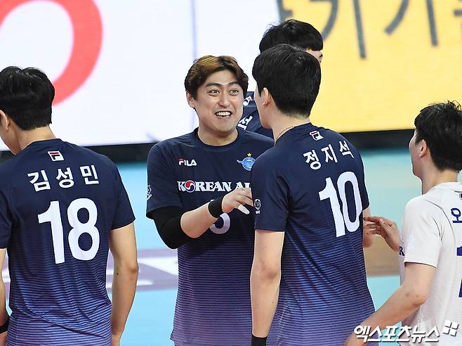 [엑스포츠뉴스 인천, 박지영 기자] 15일 오후 인천 계양체육관에서 열린 '도드람 2020-2021 V리그' 남자부 대한항공과 KB손해보험의 경기, 대한항공 유광우가 득점한 정지석을 향해 격려하고 있다.
