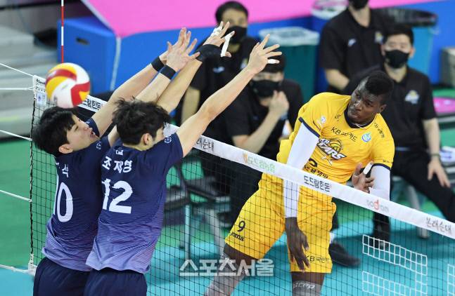 KB손해보험 케이타(오른쪽)가 15일 인천 계양체육관에서 열린 2020-2021 V리그 남자부 대한항공과 KB손해보험의 경기에서 스파이크 공격을 하고 있다. 2021. 1. 15.