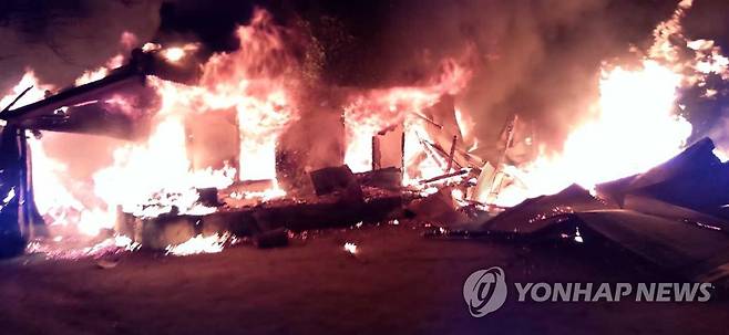 (양양=연합뉴스) 15일 오후 6시 45분께 강원 양양군 손양면 우암리 마을회관 인근 목조주택에서 화재가 나 불길과 연기가 솟구치고 있다. 2021.1.15 [양양소방서 제공. 재판매 및 DB 금지]