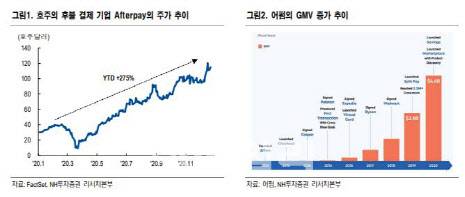 강혜승 미래에셋대우 연구원은 “혁신 금융상품 BNPL 시장은 발달 초기 단계(글로벌 이커머스 결제 1.6% 비중)”라며 “특히 신용카드를 보유하지 않고 있거나 선호하지 않는 MZ세대 소비 성장에 노출돼 높은 성장 잠재력을 지닌다”고 판단했다.