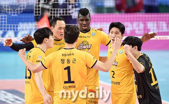 [마이데일리 = 인천 김성진 기자] KB손해보험 선수들이 15일 오후 인천 계양체육관에서 진행된 '도드람 2020-2021 V리그' 남자부 대한항공과 KB손해보험의 경기에서 득점을 올린 후 기뻐하고 있다.- ⓒ마이데일리(www.mydaily.co.kr). 무단전재&재배포 금지 -