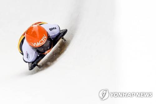 epa08938807 Tina Hermann of Germany in action during the women's Skeleton World Cup event in St. Moritz, Switzerland, 15 January 2021. EPA/GIAN EHRENZELLER