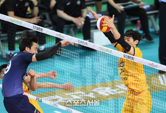KB손해보험 박진우(오른쪽)가 15일 인천 계양체육관에서 열린 2020-2021 V리그 남자부 대한항공과 KB손해보험의 경기에서 대한항공 진성태의 공격을 블로킹하고 있다. 2021. 1. 15.