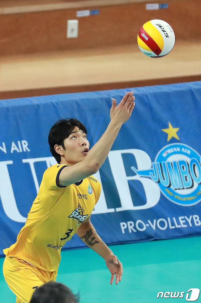 (인천=뉴스1) 구윤성 기자 = 15일 오후 인천계양체육관에서 열린 프로배구 '도드람 2020-2021 V리그' 대한항공과 KB손해보험의 경기에서 KB손해보험 최익제가 서브를 시도하고 있다. 2021.1.15/뉴스1