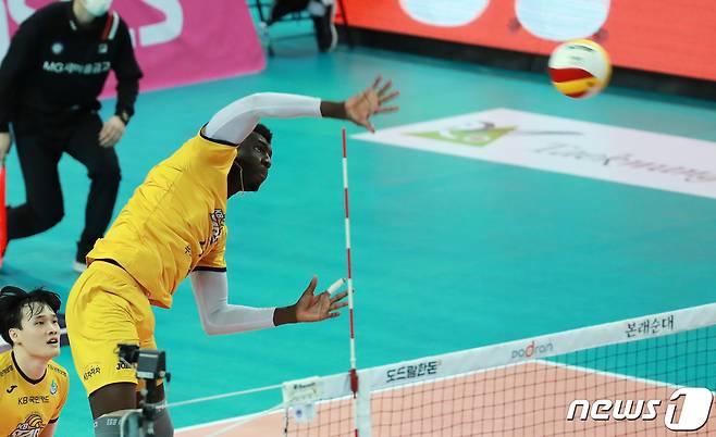 (인천=뉴스1) 구윤성 기자 = 15일 오후 인천계양체육관에서 열린 프로배구 '도드람 2020-2021 V리그' 대한항공과 KB손해보험의 경기에서 KB손해보험 케이타가 스파이크를 시도하고 있다. 2021.1.15/뉴스1