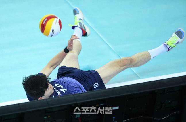 대한항공 정지석이 15일 인천 계양체육관에서 열린 2020-2021 V리그 남자부 대한항공과 KB손해보험의 경기에서 공을 살려내기 위해 몸을 던지고 있다. 2021. 1. 15.