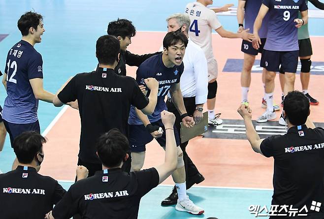 경기 종료 후 대한항공 임동혁이 승리의 기쁨을 나누고 있다.