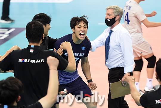 [마이데일리 = 인천 김성진 기자] 대한항공 임동혁이 15일 오후 인천 계양체육관에서 진행된 '도드람 2020-2021 V리그' 남자부 대한항공과 KB손해보험의 경기에서 세트스코어 3-2(25-16, 21-25, 25-21, 21-25, 15-13)로 승리를 한 후 포효하고 있다.- ⓒ마이데일리(www.mydaily.co.kr). 무단전재&재배포 금지 -
