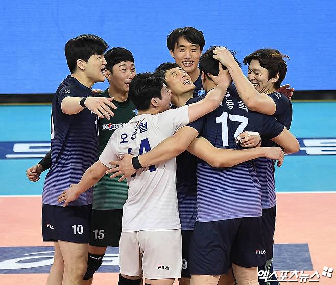 경기 종료 후 대한항공 선수들이 승리의 기쁨을 나누고 있다.