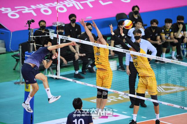 대한항공 곽승석(왼쪽)이 15일 인천 계양체육관에서 열린 2020-2021 V리그 남자부 대한항공과 KB손해보험의 경기에서 스파이크 공격을 하고 있다. 2021. 1. 15.