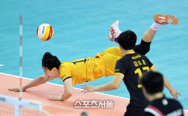 KB손해보험 김정호가 15일 인천 계양체육관에서 열린 2020-2021 V리그 남자부 대한항공과 KB손해보험의 경기에서 공을 향해 몸을 던지고 있다. 2021. 1. 15.