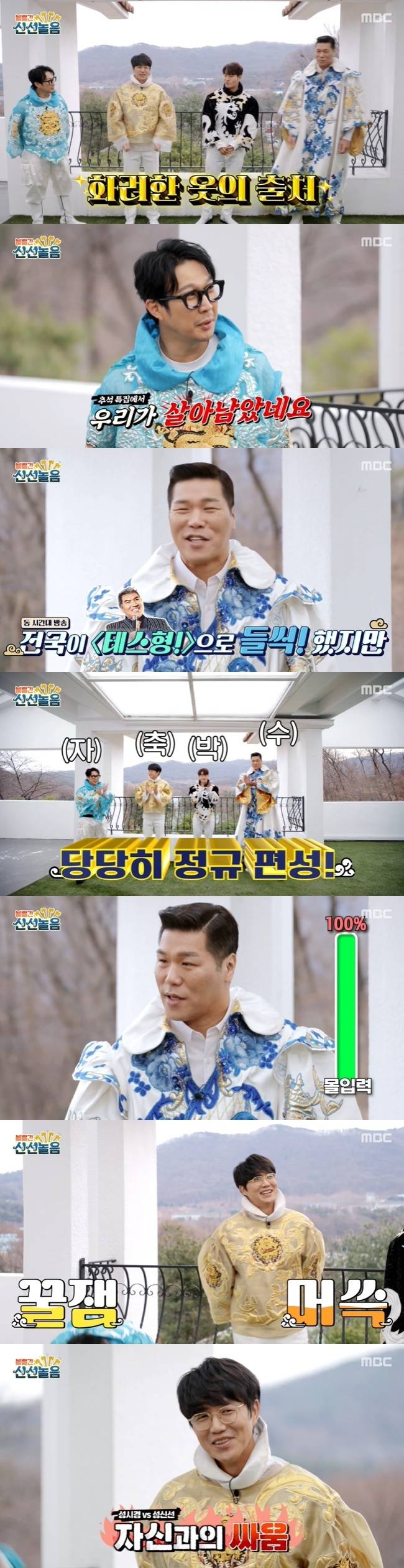 이날 하하, 성시경, 김종국, 서장훈은 각각 하산, 성산, 꾹산, 서산이라는 이름으로 등장했다. 화려한 옷을 입고 등장한 하하는 “우리가 살아 남았다”고 너스레를 떨었다. 이에 서장훈도 “옆에서 ‘테스형!’을 그렇게 부르셨는데 우리가 살아남았다. ‘볼빨간 라면연구소’에서 ‘볼빨간 신선놀음’으로 돌아왔다”며 정규 방송으로 편성된 것을 환영했다.